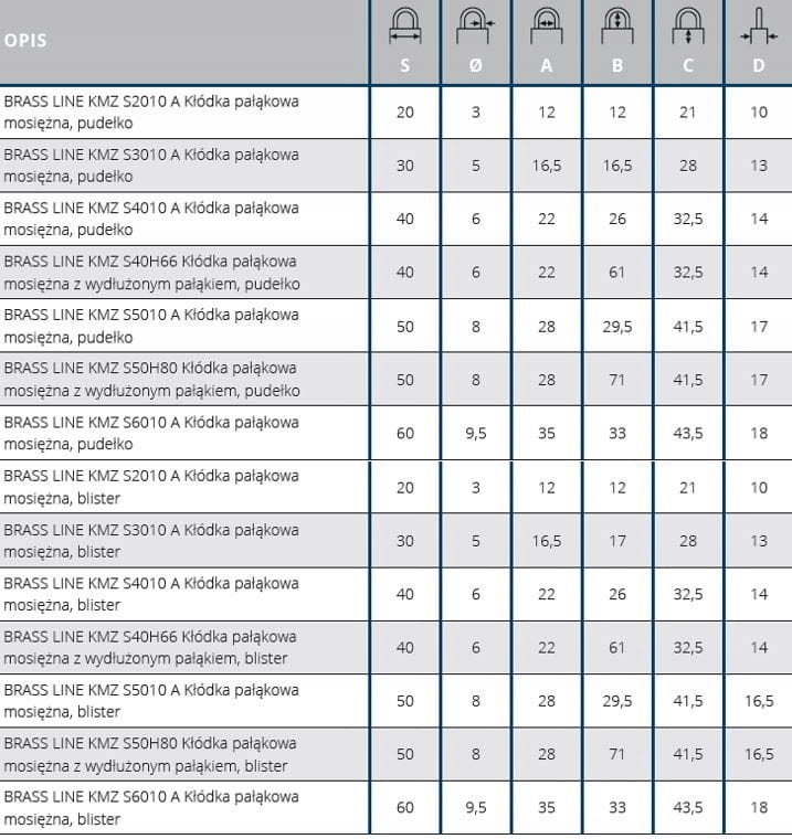 Kłódka może zostać wykonana w systemie jednego klucza, oznacza to, że na działce może być 10 kłódek, a tylko jeden klucz do wszystkich (domek, łódka, brama, furtka, itp.). Kłódki mosiężne pałąkowe serii BRASS LINE wyposażone są w masywny mosiężny korpus, pałąk ze stali hartowanej, sprężyny ze stali nierdzewnej. Posiadają też zwiększoną odporność na korozję. Posiadają też zwiększoną odporność na korozję.