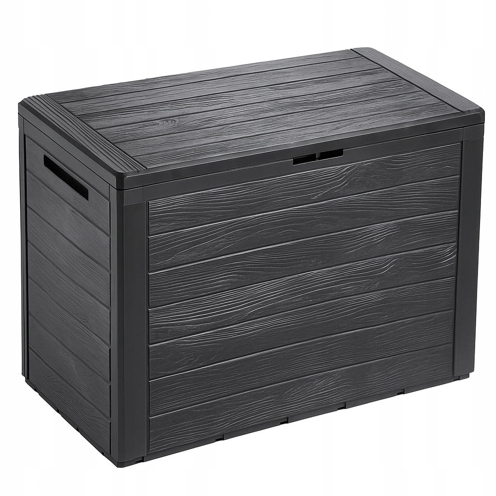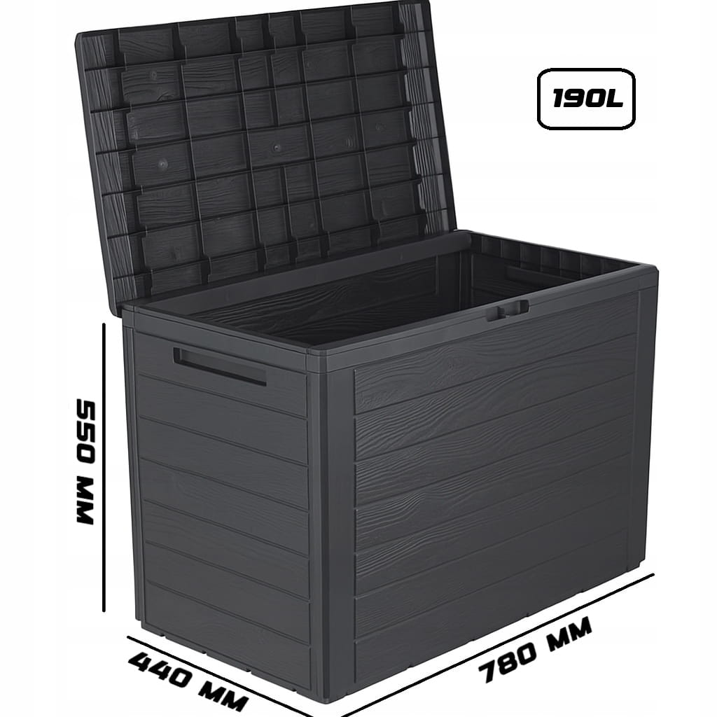 Praktyczny pojemnik o pojemności 190 litrów – idealny do przechowywania większych przedmiotów, poduszek ogrodowych, narzędzi czy akcesoriów tarasowych.