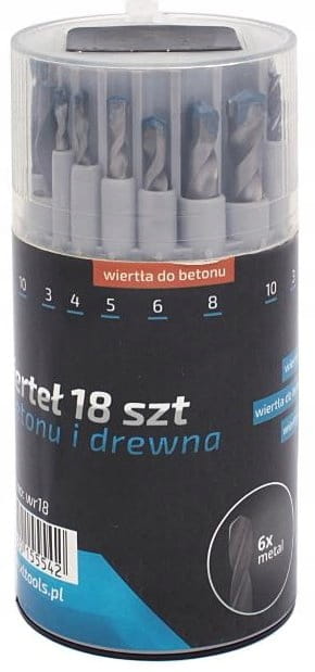 Komplet podstawowych wierteł do muru, metalu i drewna. Niezastąpiony w domu, garażu itd.
